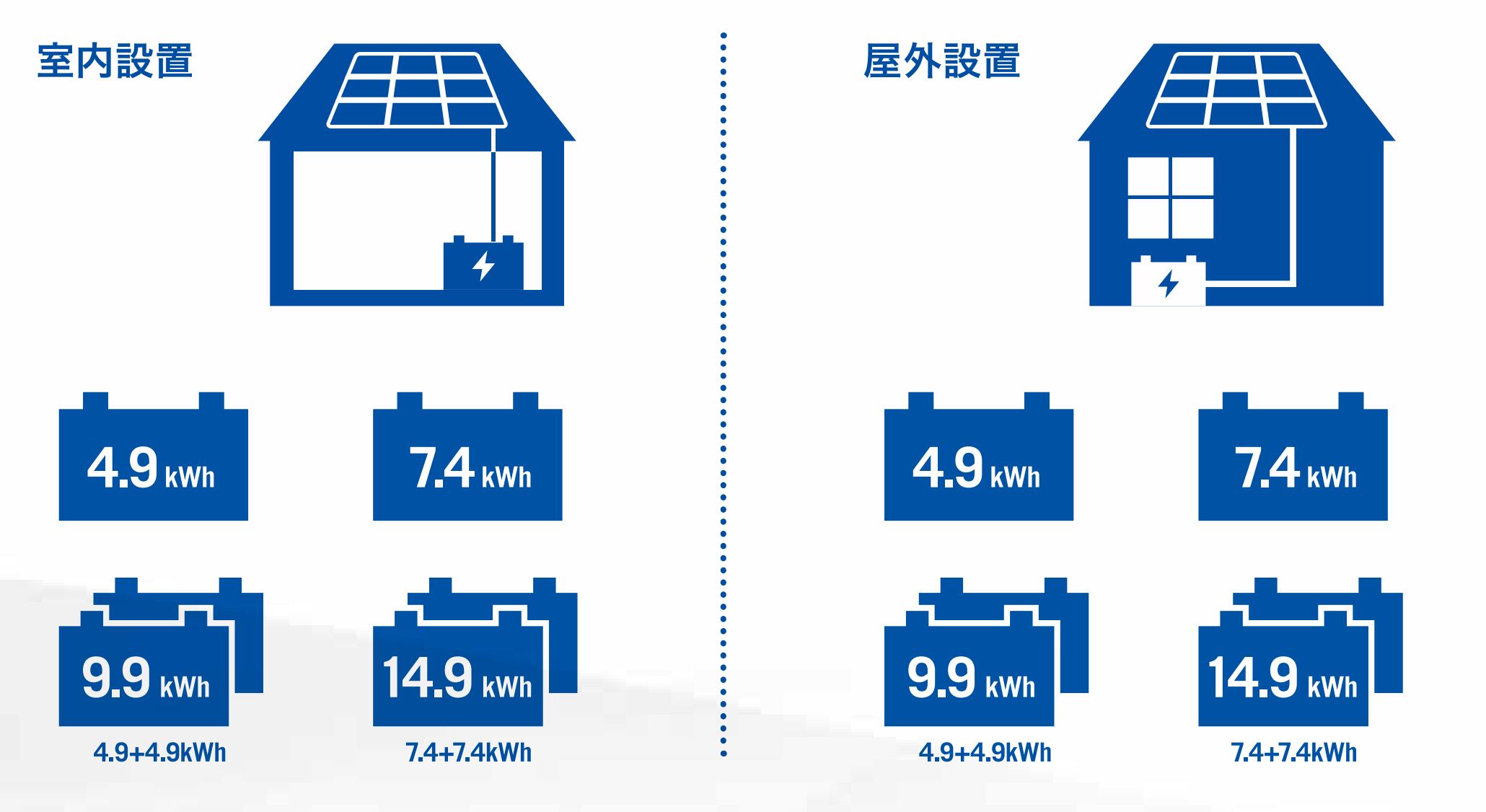 4.9kWhと7.4kWhの容量の蓄電池の組み合わせで、計4パターンの容量を選ぶことができます。後からの増設も可能なのでライフパターンにあわせて自由にセレクトできます。